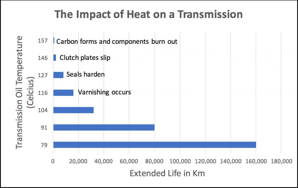 Ideally a transmission will operate at 79oC. For every 11oC above this temperature you can reduce your transmission’s life by up to half.